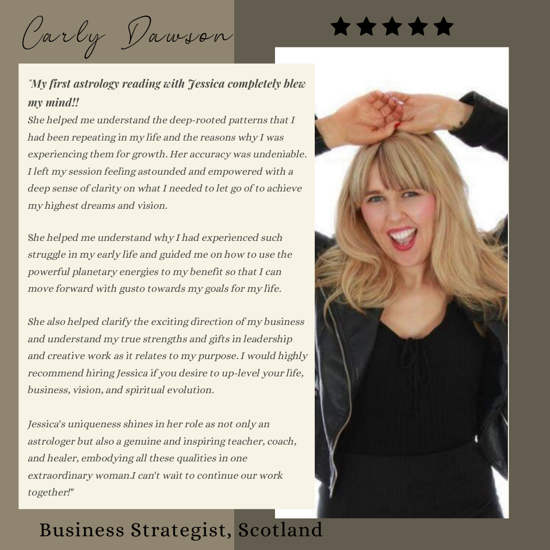 Jessica uses the map of your chart, in direct communication with you, as a reference point to discover greater awareness of your life as you are experiencing it and the deeper soul dynamics you have questions or concerns about. There is a focus on understanding where your soul's intention is focusing its growth in this lifetime.